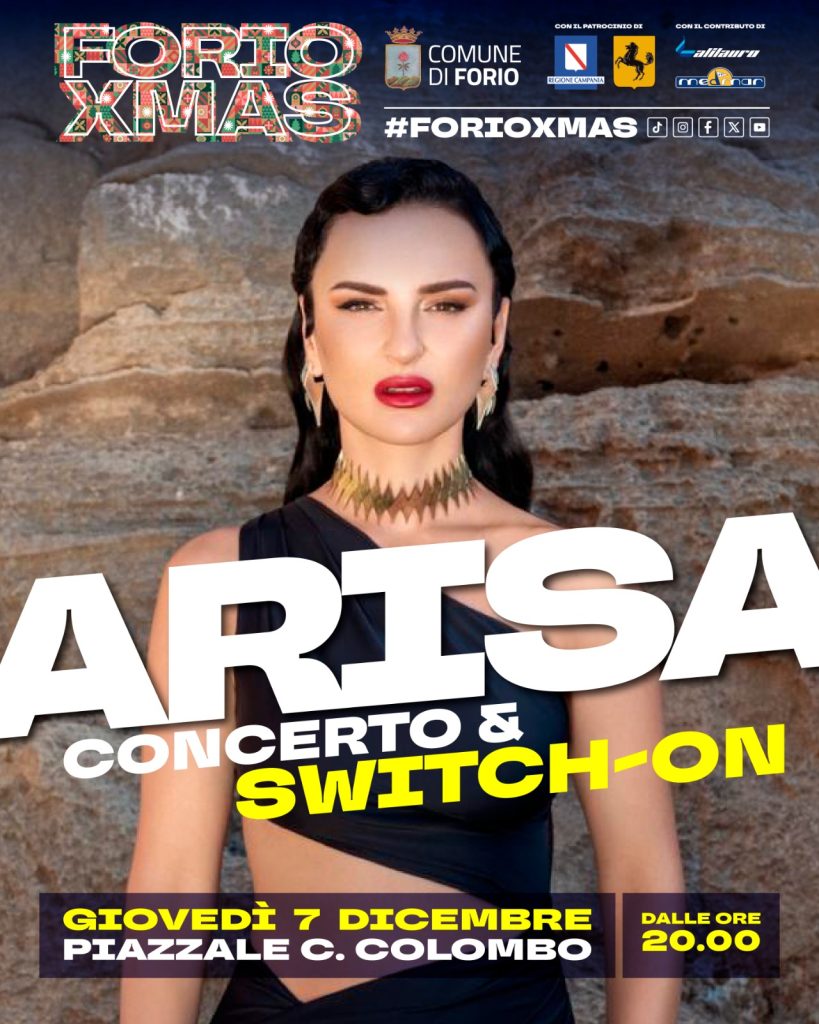 L’evento #FORIOXMAS è un appuntamento imperdibile che segna l’inizio delle celebrazioni natalizie a Forio. Con il patrocinio del Comune e il supporto di sponsor locali, questa serata si preannuncia come una delle più brillanti e attese della stagione. Arisa, con la sua arte, sarà la musa che guiderà la comunità di Forio e i suoi ospiti in un viaggio musicale ricco di emozioni e spirito festivo.