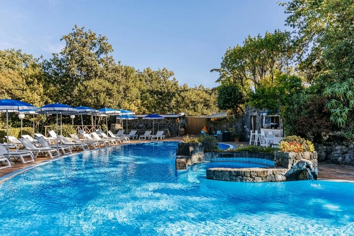 Piscina termale (28°/30°C) con idromassaggio, lettini e sdraio, snack bar presso la piscina, solarium e parco-giardino.