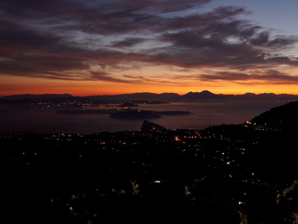 \t\t\t\tCrepuscolo prima dell’Alba da Candiano Ischia, in primo piano il comune di Ischia Porto con il Castello Aragonese, l’isola di Procida, Capo Miseno ed il Maestoso Vesuvio\t\t\t\t