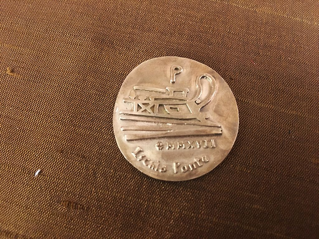 Navigando Verso Aenaria : la moneta riproduce al dritto un disco di lucerna, rinvenuta nel corso degli scavi subaquei di Aenaria, decorata con grifone stante volto a sinistra; il bollo CMAREVP, apposto sul fondo del reperto, consente di attribuirla al lucernarius Caius Marius Evpor che operò in officine africane tra il 12 e il 180 d.c.